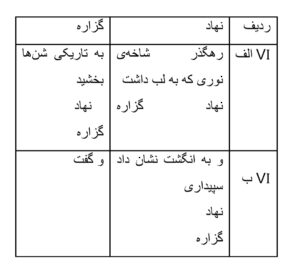 گفتیم در شعر نشانی به دو بخش کلی A و B و در بخش A نیز در وهلهی اول به سه زیربخش Ι، ΙΙ، ΙΙΙ روبهروییم؛ اما بخش A دارای تکهی دیگری هم هست که از نظر ساختار با سه تکهی دیگر متباین است و آن VΙ: «رهگذر شاخهی نوری که به لب داشت به تاریکی شنها بخشید و به انگشت نشان داد سپیداری و گفت» است. که اگرچه این تکه از دو بخش تشکیل شده، حرف ربط «و» میان دو جمله باعث شده است تا نتوانیم بهراحتی آن را دو پاره در نظر بگیریم؛ بهجز این، ساختار هر دو جملهی این بخش هم با ساختار جملات سه بخش اول متضاد است.