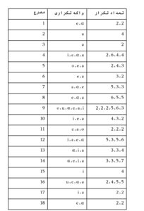 در جدول زیر بندهای شعر نشانی بهترتیب (طبق متن ارائهشده در همین نوشتار) و بیتوجه به بخشبندی پیشین بر حسب توالی و تکرار واکهها و همخوانهای موجود در هر بند آورده شده است.